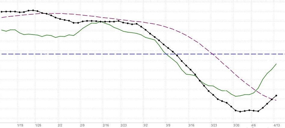 The dashed red line can be used in combination with the black dotted line as a short-term buy/sell signal generator, but all signals must be confirmed by the green confirmation line. For example, say the black dotted line is below the horizontal line (indicating a negative market bias), and it crosses above the dashed dark-red line. If, at the same time, the green line is rising, then a cross above the red line may be interpreted as a buy signal in a negative environment for a short-term trade. All such signals must be viewed with respect to the prevailing context and the risks implied by the current configurations. Nothing on this Website should be interpreted as a buy or sell recommendation. Our indicators may generate buy or sell signals, but never buy or sell recommendations.