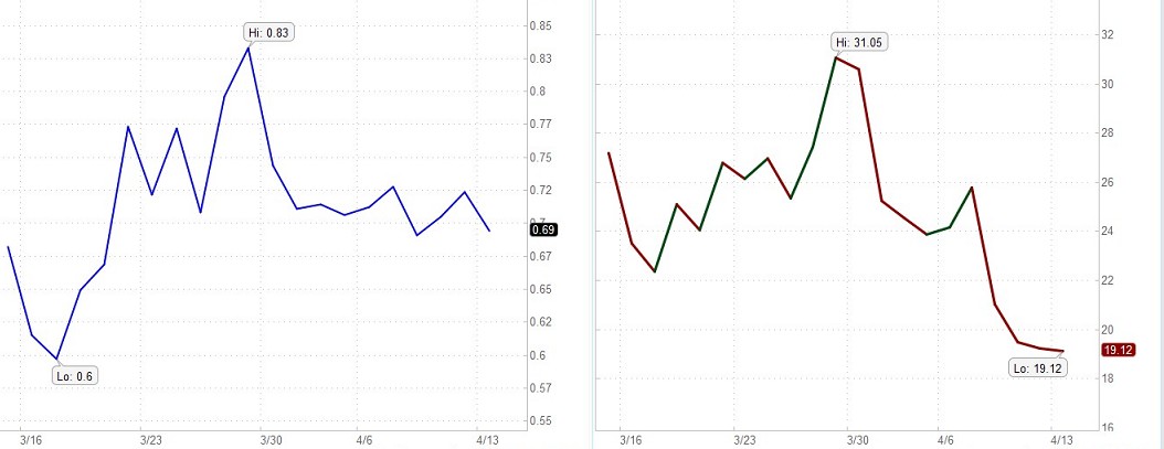A low VIX, a range of 20 to 25, indicates traders have become somewhat uninterested in the market and generally indicates a sell-off. The value of VIX increases as the market goes down and decreases when the market moves in an upward direction. A rising stock market is seen as less risky and a declining stock market more risky. The higher the perceived risk in stocks, the higher the implied volatility and the more expensive the associated options, especially puts. Hence, implied volatility is not about the size of the price swings, but rather the implied risk associated with the stock market. When the market declines, the demand for puts usually increases. Increased demand means higher put prices and higher implied volatilities.