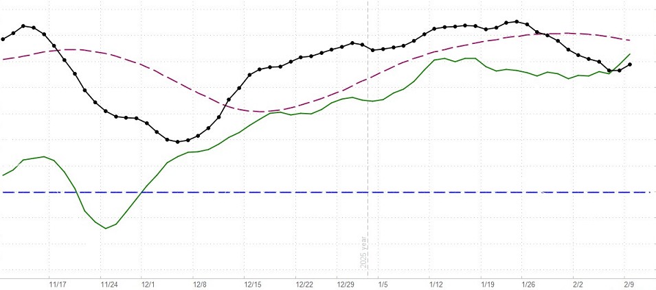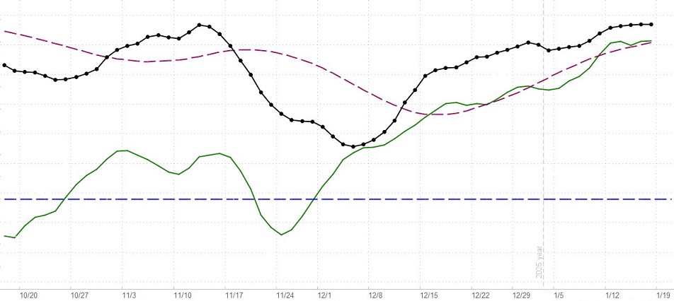 The dashed red line can be used in combination with the black dotted line as a short-term buy/sell signal generator, but all signals must be confirmed by the green confirmation line. For example, say the black dotted line is below the horizontal line (indicating a negative market bias), and it crosses above the dashed dark-red line. If, at the same time, the green line is rising, then a cross above the red line may be interpreted as a buy signal in a negative environment for a short-term trade. All such signals must be viewed with respect to the prevailing context and the risks implied by the current configurations. Nothing on this Website should be interpreted as a buy or sell recommendation. Our indicators may generate buy or sell signals, but never buy or sell recommendations.
