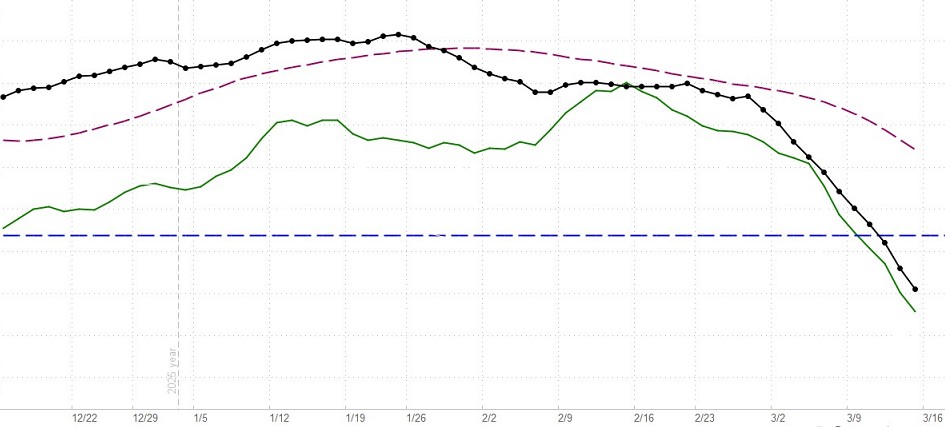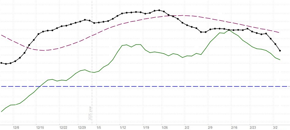 This is updated daily. When the black line with dots (the indicator line) is above the horizontal blue line, this indicator is telling us that the market has a positive or bullish bias (in the short-term to intermediate-term, even if not in the long-term). If the black dotted line is declining toward the horizontal line, bullish sentiment is decreasing but still present. A negative or bearish bias will be indicated when the black line crosses below the horizontal line.