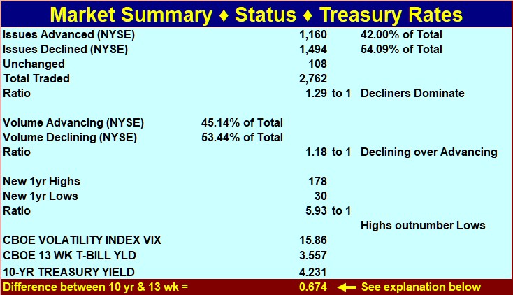 Interest Rate spread The left chart above shows the difference between the long-term (10-year) and short-term (13-week) interest rates over recent months. When the spread between short-term rates and long-term rates is +1.3% to +2% (short-term lower than long-term), the economy is thought to be in for a normal growth rate in the vicinity of 2% to 3%. If the difference is more than that, it is probably because the Central Bank is making money more easily available and the economy will likely undergo accelerated growth. When companies can get cheap money, they can more easily afford to invest in projects, facilities, and equipment that will expand business or improve operations. If the interest rate spread is negative (short-term money more expensive than long-term money, then money is being made more difficult to obtain by the Central Banks (they are attempting to reduce the rate of inflation). This will, of course, slow down the amount of capital investment made by companies. Economic expansion will be mitigated. If the spread is a negative 1.5% (or even more), then the probability is 70% that economic recession will occur within a year. This information can be the basis for some general guidelines. If the spread is negative, make stop losses hug price action more snugly and use other techniques you may be aware of to guard or enhance assets in the event of market decline. If the short-term rate is enough higher that the interest rate spread is -1% or more, cash might be your best option. If the chart indicates that the current spread is .76, then the current spread is a little more than ¾ of 1%. The fact that the number is positive (the line is above zero) means the long-term rates are greater than the short-term rates. If the number is negative (the line is below zero) it means the short-term rates are greater than the long-term rates. a.) If the spread is negative, tighten stops or take other protective measures. b.) If short-term rates are 1% or more higher than long-term rates, cash might be a more appropriate investment (Remember that the bear market that began in 2000 started under these conditions). c.) When the spread between short-term and long-term money is less than 1%, higher-quality growth stocks are better candidates. d.) When short-term money costs 1% to 3% less than long-term money, stocks are generally even more likely to be profitable. A greater variety of stocks will advance in valuations. e.) If the spread is more than 3%, assume that inflation is just around the corner.