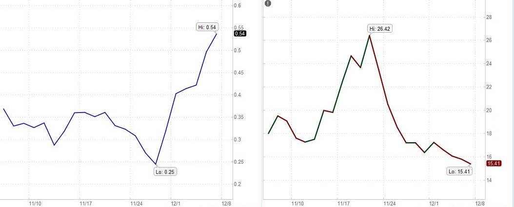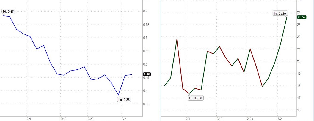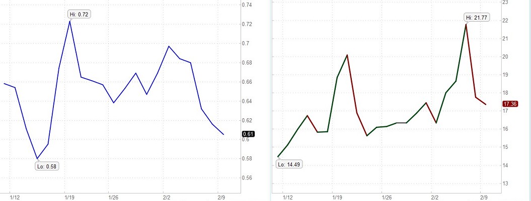 A low VIX, a range of 20 to 25, indicates traders have become somewhat uninterested in the market and generally indicates a sell-off. The value of VIX increases as the market goes down and decreases when the market moves in an upward direction. A rising stock market is seen as less risky and a declining stock market more risky. The higher the perceived risk in stocks, the higher the implied volatility and the more expensive the associated options, especially puts. Hence, implied volatility is not about the size of the price swings, but rather the implied risk associated with the stock market. When the market declines, the demand for puts usually increases. Increased demand means higher put prices and higher implied volatilities.
