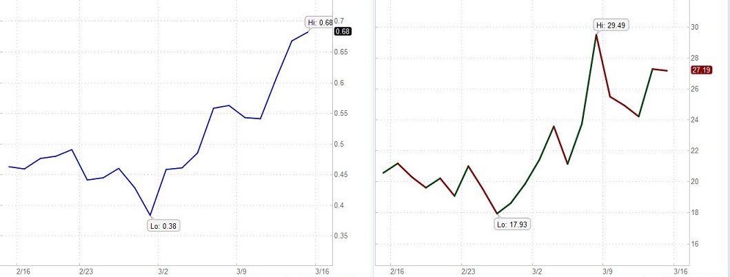 VIX VIX values greater than 30 are generally associated with a large amount of volatility as a result of investor fear or uncertainty, while values below 20 generally correspond to less stressful, even complacent, times in the markets.