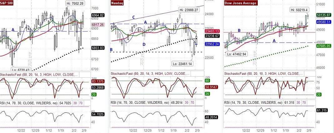 ♦ The Dow last closed at 50135.87, up 20.2 points or 0.04%, the S&P 500 last closed at 6964.82, up 32.52 points or 0.47%, and the Nasdaq Composite Index last closed at 23238.66, up 207.4567 points or 0.90%. The following comments for the Dow, S&P 500, and Nasdaq are based on the widely respected R.C. Allen buy/sell strategy.
