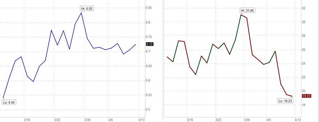 A low VIX, a range of 20 to 25, indicates traders have become somewhat uninterested in the market and generally indicates a sell-off. The value of VIX increases as the market goes down and decreases when the market moves in an upward direction. A rising stock market is seen as less risky and a declining stock market more risky. The higher the perceived risk in stocks, the higher the implied volatility and the more expensive the associated options, especially puts. Hence, implied volatility is not about the size of the price swings, but rather the implied risk associated with the stock market. When the market declines, the demand for puts usually increases. Increased demand means higher put prices and higher implied volatilities.